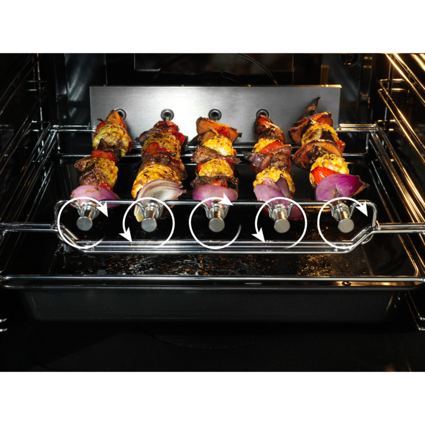Ψήστε εύκολα και τέλεια τα σουβλάκια με τη σχάρα μπάρμπεκιου BBQ Rack. Απλώς τοποθετήστε τα πέντε σουβλάκια στο φούρνο, επιλέξτε την αντίστοιχη λειτουργία και το μοτέρ περιστρέφει αυτόματα τα κρέατα και τα λαχανικά. Το αποτέλεσμα είναι τραγανή και ομοιόμορφα ψημένη νοστιμιά.