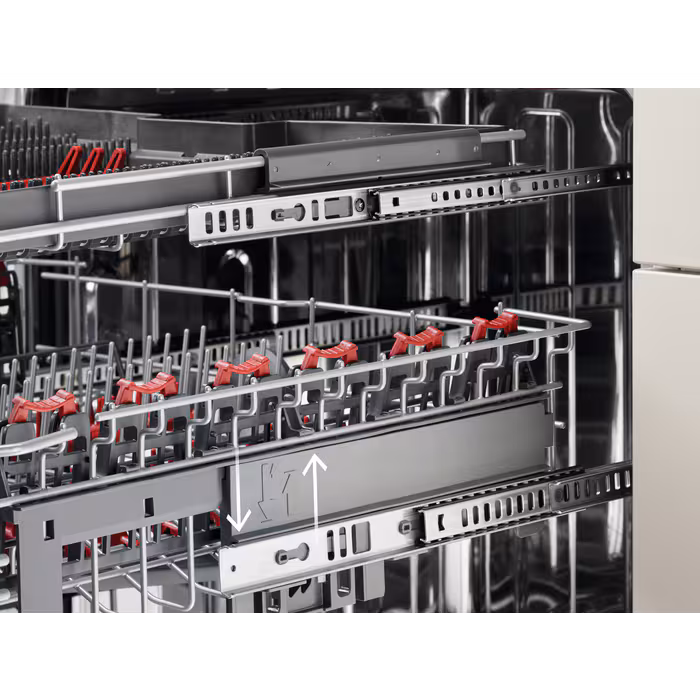 Δημιουργήστε εύκολα περισσότερο χώρο στο πάνω ή κάτω μέρος με το ρυθμιζόμενου ύψους πάνω καλάθι. Απλά, πιάστε τη χειρολαβή από τις δύο πλευρές του πάνω καλαθιού και τραβήξτε ελαφρά προς τα πάνω για να σηκώσετε ή να χαμηλώσετε τη μία ή και τις δύο πλευρές.