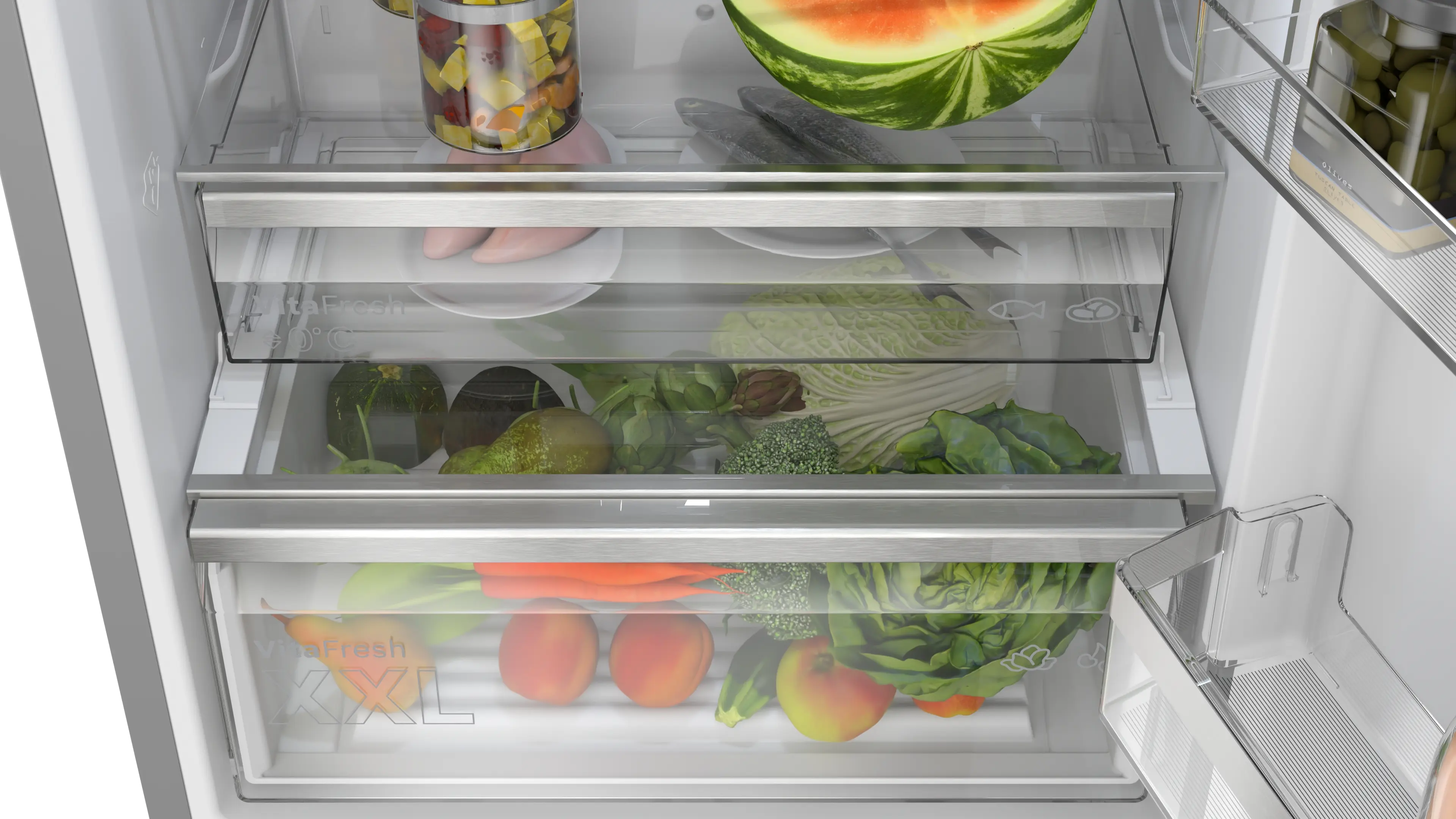 Το ευρύχωρο σύστημα αποθήκευσης και φρεσκάδας VitaFresh XXL <0°C> προσφέρει το ιδανικό περιβάλλον αποθήκευσης για τα φρέσκα τρόφιμα. Διατηρεί χαμηλότερες θερμοκρασίες για το ψάρι και το κρέας και κρατά πραγματικά φρέσκα τα φρούτα και τα λαχανικά σας.