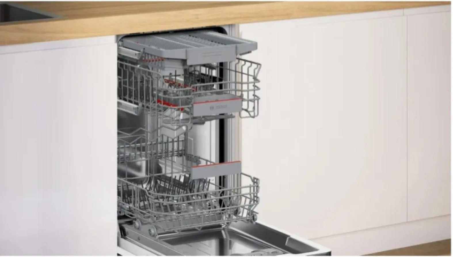 Το συρτάρι Bosch Vario3 όχι μόνο παρέχει ξεχωριστό διαμέρισμα για κάθε μαχαίρι , πιρούνι και κουτάλι, αλλά χωράει επίσης κουτάλες, χτυπητήρια, μικρά φλιτζάνια, δοχεία πρωινού και μπολ χάρη στα δύο κόκκινα, πτυσσόμενα τμήματα. Αυτό απελευθερώνει χώρο στα υπόλοιπα ράφια .