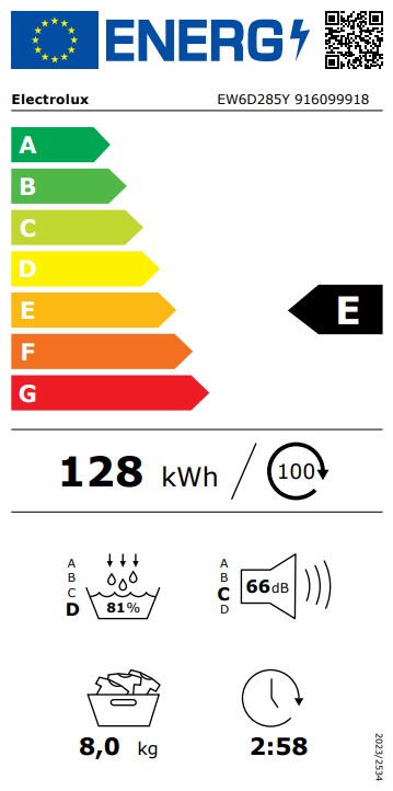 Electrolux EW6D285Y GentleCare Στεγνωτήριο Ρούχων 8kg, με Αντλία θερμότητας, Ε, Λευκό