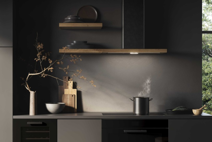 Ένας επιτοίχιος απορροφητήρας με πρωτότυπο σχεδιασμό, διαθέσιμος σε ματ μαύρο φινίρισμα, που συμπληρώνεται από ειδικές πινελιές από ξύλο βελανιδιάς.