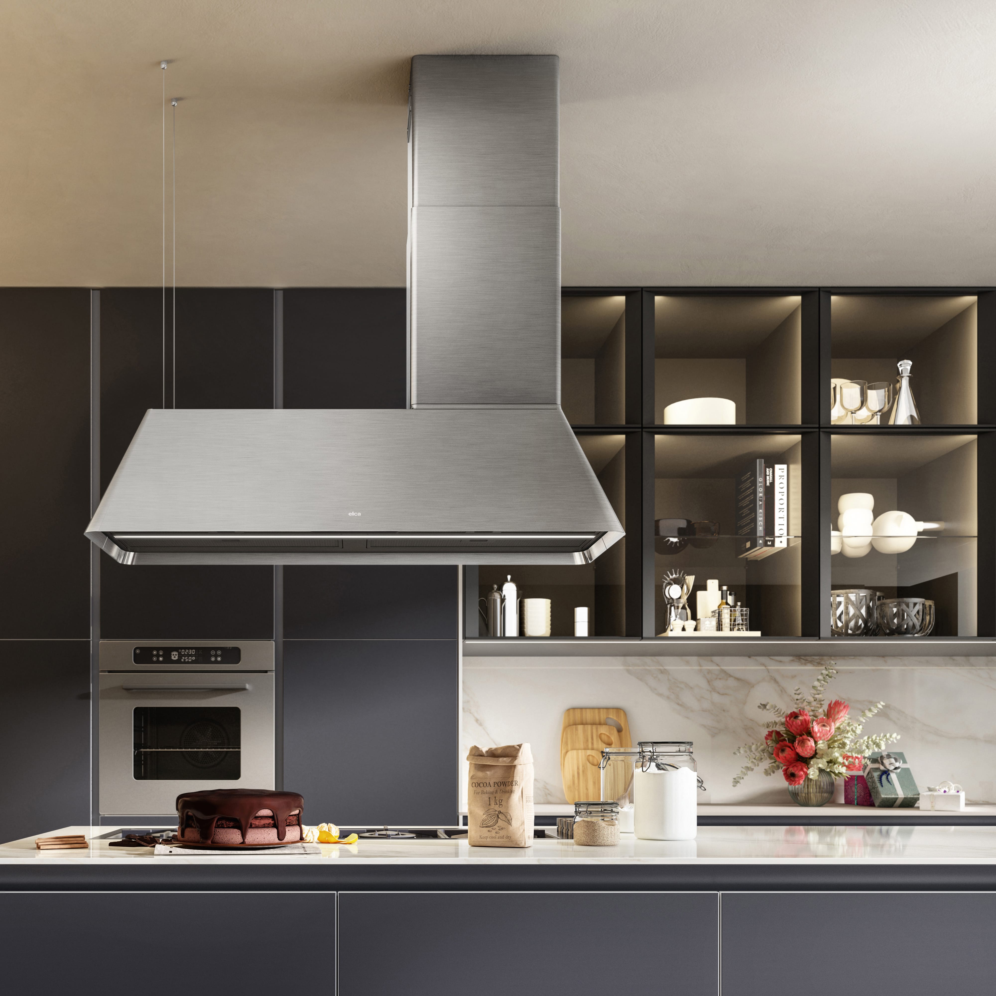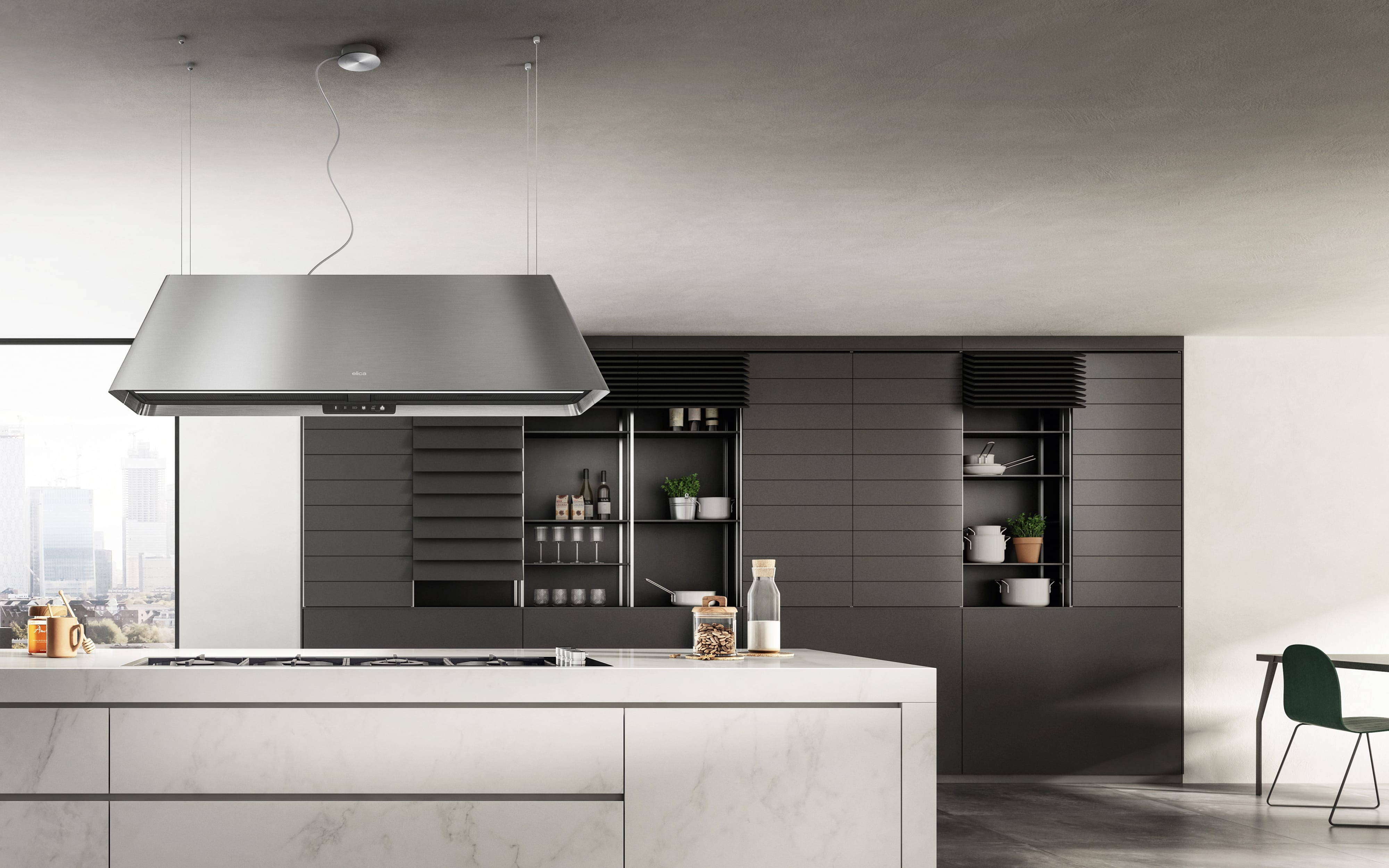 Δύο ξεχωριστές λειτουργίες σε ένα μοναδικό σχεδιασμό. Δύο λύσεις σε μία: ένας απορροφητήρας και ένας καθαριστής αέρα μετατρέπονται σε ένα πρωτότυπο, ευέλικτο και εντυπωσιακό διακοσμητικό κομμάτι που προσφέρει βέλτιστη επεξεργασία αέρα. Αρχικά, απορροφά καπνό, οσμές και αλλεργιογόνα και στη συνέχεια παρέχει καθαρό και καθαρισμένο αέρα. Κάθε λειτουργία μπορεί να χρησιμοποιηθεί ανεξάρτητα, επομένως είναι απίστευτα ευέλικτη.