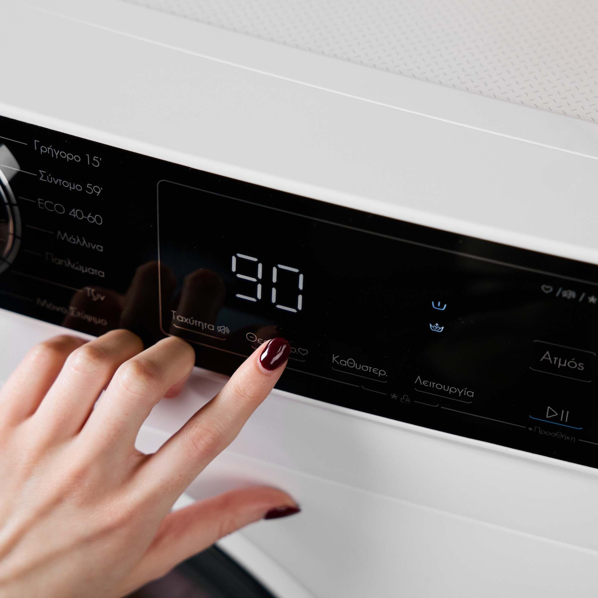 Με το ηλεκτρονικό χειριστήριο αφής και τη μεγάλη LCD οθόνη, έχεις τον έλεγχο της πλύσης στα χέρια σου. Η ένδειξη υπολειπόμενου χρόνου σε ενημερώνει πότε θα τελειώσει η πλύση, για να οργανώνεις καλύτερα τη μέρα σου. Και η βοηθητική λειτουργία ατμού φροντίζει για καλύτερο καθαρισμό και φρεσκάδα χωρίς κόπο.