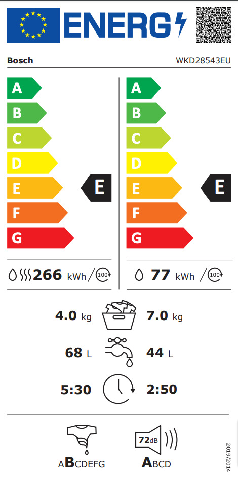 Είναι ενεργειακής κλάσης E, που σημαίνει ότι έχει συνολικά μεγάλη κατανάλωση, σε σχέση με τα υπόλοιπα πλυντήρια - στεγνωτήρια ρούχων ενεργειακής κλάσης D και άνω.
