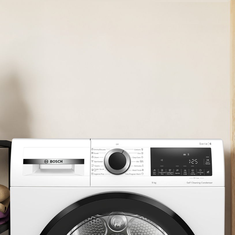 Το Bosch WQG14500BY αναγνωρίζει αυτόματα το φορτίο ρούχων και με τη λειτουργία HalfLoad προσαρμόζει διάρκεια και ένταση στεγνώματος για μικρά φορτία. Έτσι, ακόμα και όταν έχεις μόνο λίγα ρούχα, το αποτέλεσμα παραμένει τέλειο χωρίς σπατάλη ενέργειας.