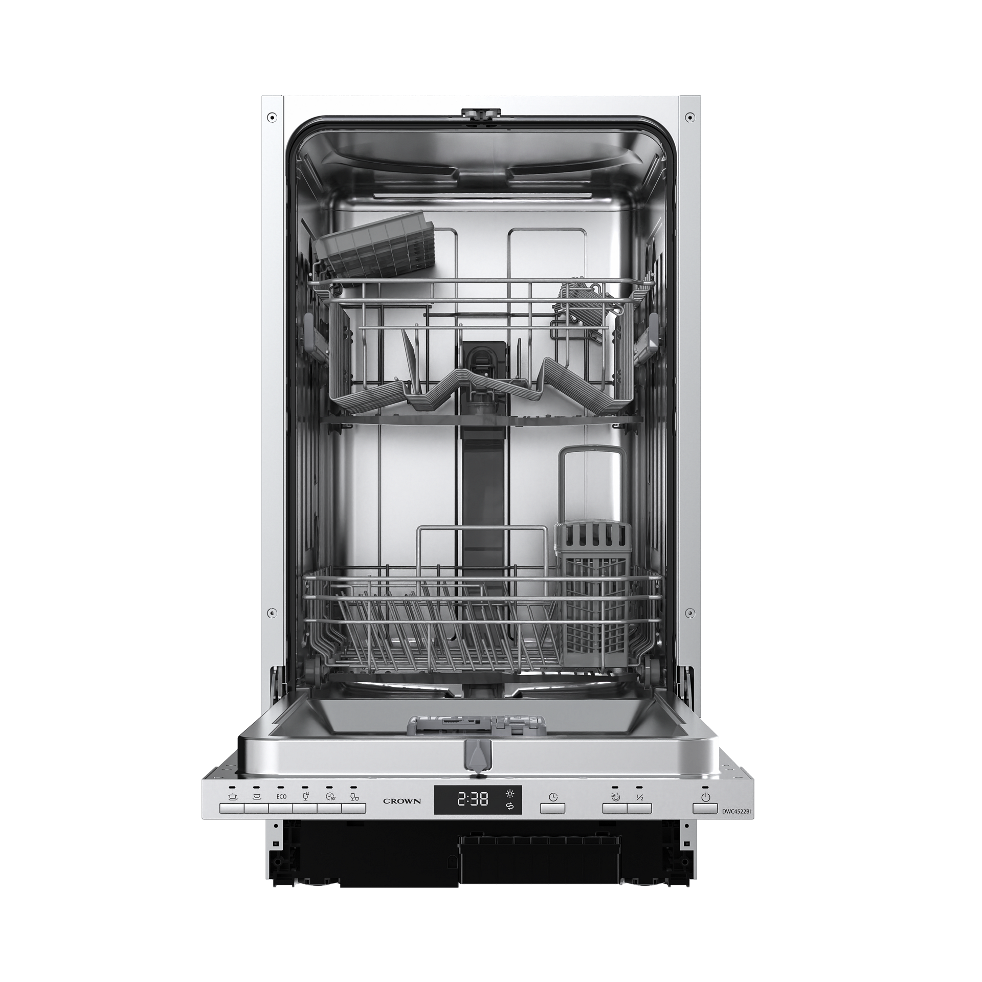 Με το μοντέλο Crown DWC4522BI πλάτους 45cm , έχετε 10 σερβίτσια, 6 προγράμματα και οικονομική κατανάλωση 9 λίτρων νερού στον κύκλο ECO . Η χαμηλή στάθμη θορύβου των 49 dB εγγυάται ηρεμία κατά τη διάρκεια του πλυσίματος, ενώ η λειτουργία 1/2 φορτίου και καθυστέρησης έναρξης παρέχουν ευελιξία για τον πολυάσχολο ρυθμό σας. Δύο καλάθια με πτυσσόμενες ποτηροθήκες εξασφαλίζουν εύκολη τοποθέτηση διαφορετικών πιάτων και βέλτιστη αξιοποίηση του χώρου.