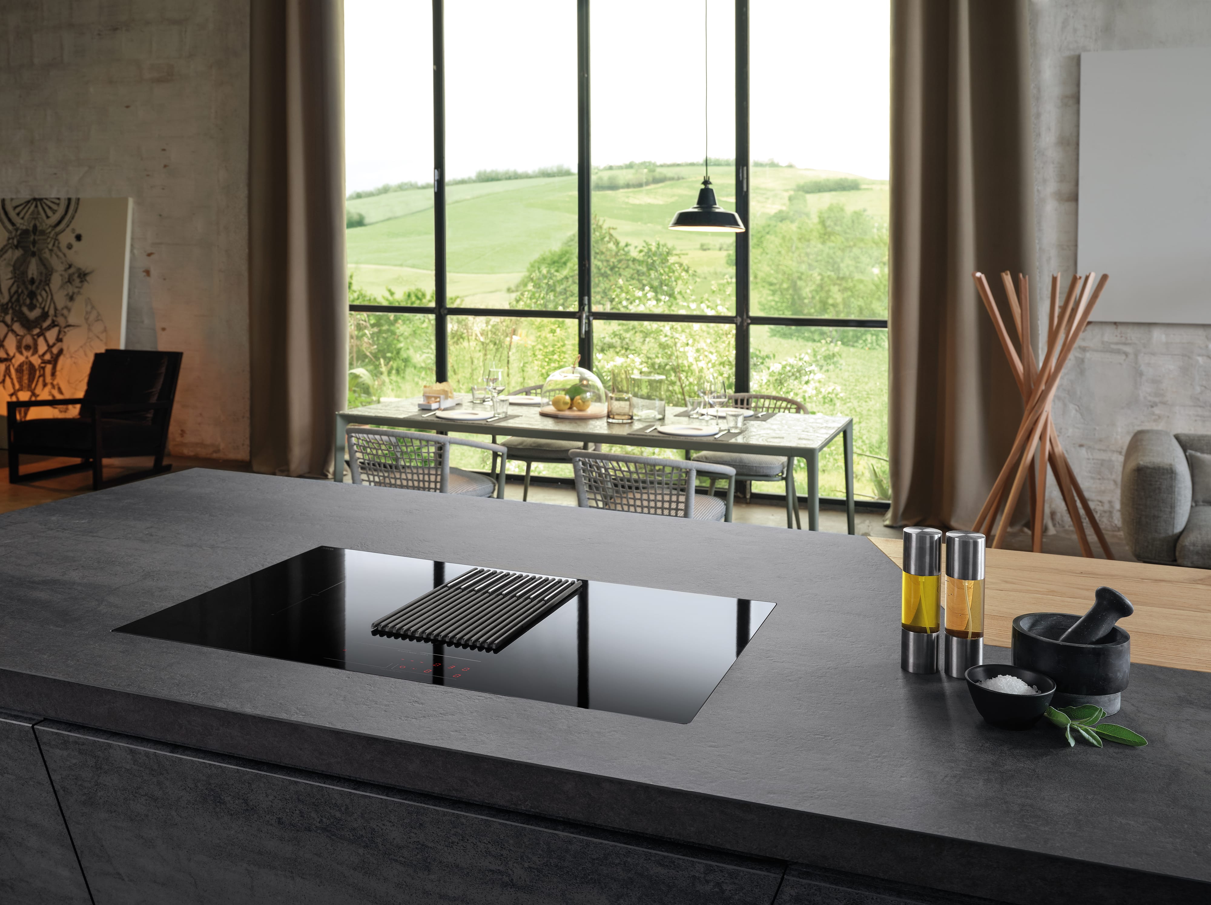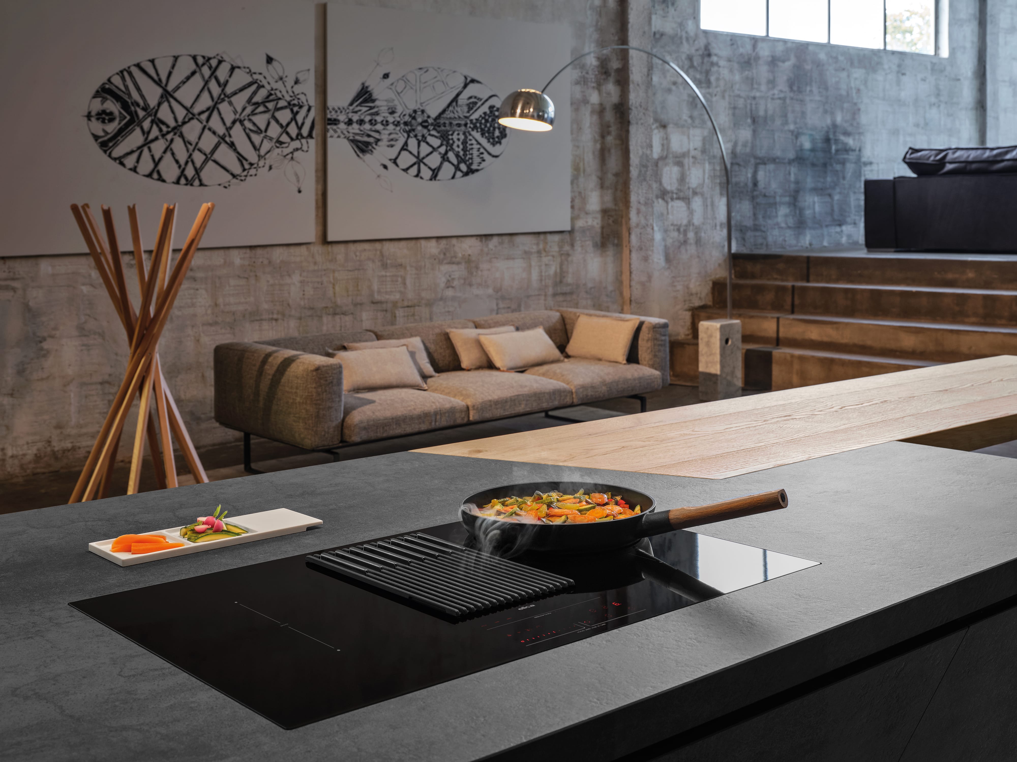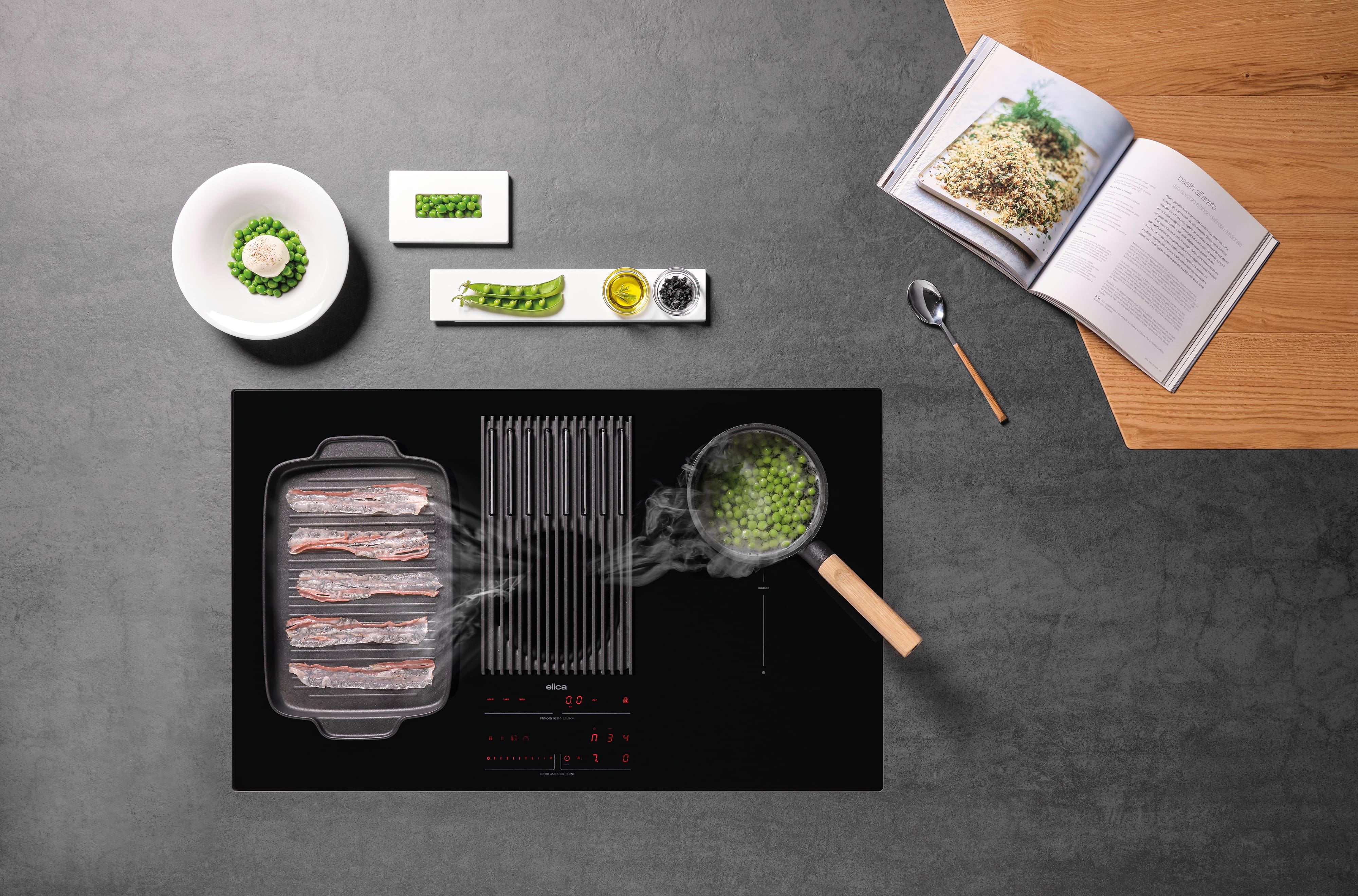 Μετρήστε, ζυγίστε, μαγειρέψτε. Όλα από ένα σημείο. Μπορείτε επιτέλους να μαγειρεύετε χωρίς να μετακινείστε συνεχώς από εδώ και εκεί: μπορείτε να ζυγίζετε τα υλικά απευθείας στην εστία, εξοπλισμένη με εύχρηστο απόβαρο, συνεχή ζύγιση και λειτουργίες μνήμης. Όλες αυτές οι λειτουργίες είναι όσο το δυνατόν πιο εύκολες, χάρη στο φιλικό προς το χρήστη περιβάλλον εργασίας που είναι εξαιρετικά εύκολο στη ρύθμιση. Οι ζώνες μαγειρέματος είναι ευέλικτες και εργονομικές: η εστία είναι εξοπλισμένη με λειτουργία γεφύρωσης δύο ζωνών μαγειρέματος (τόσο στην αριστερή όσο και στη δεξιά πλευρά), εξασφαλίζοντας ομοιόμορφη ισχύ και θερμοκρασία, ακόμα και όταν χρησιμοποιούνται μεγαλύτερα μαγειρικά σκεύη. Το ενσωματωμένο σύστημα εξαγωγής καθαρίζει τον αέρα από καπνό και δυσάρεστες οσμές, επίσης αυτόματα, χάρη στο φίλτρο πολλαπλών χρήσεων για λίπη, οσμές και υγρασία που εξασφαλίζει μέγιστη απόδοση και εύκολη συντήρηση.