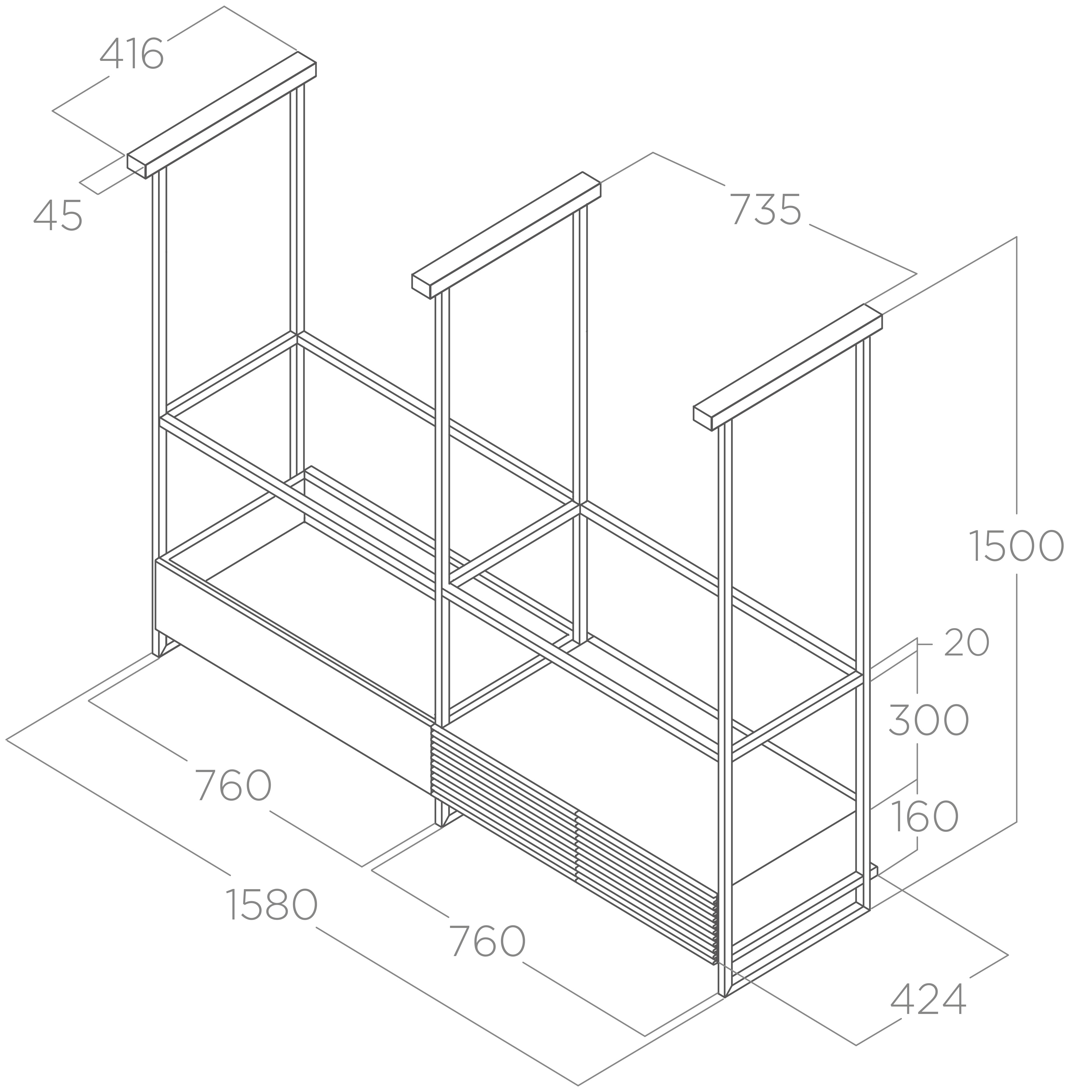 Ξεκινώντας με δύο βασικές «δομές» (80 ή 160 cm), μπορείτε να δημιουργήσετε τη δική σας σύνθεση προσθέτοντας μονάδες εξαγωγής, φωτιστικά πάνελ και μεγάλη ποικιλία ραφιών: γυαλί, μέταλλο, μαύρο μεταλλικό συρμάτινο πλέγμα και καρυδιά. Επιπλέον, τα ράφια μπορούν να συντονιστούν με την υπόλοιπη κουζίνα χάρη στο προαιρετικό πλαίσιο.