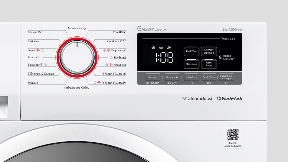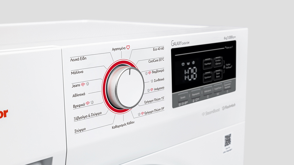 Το νέο πλυντήριο ρούχων Galaxy 6 κιλών συνδυάζει όσα χρειάζεστε καθημερινά για την καθαριότητα των ρούχων σας: φροντίδα υφασμάτων, οικονομία και ευκολία. Το πρόγραμμα CoolCare 20°C προσφέρει ήπιο αλλά αποτελεσματικό καθαρισμό, προστατεύοντας τα υφάσματα και διατηρώντας ζωντανά τα χρώματα των ρούχων. Η λειτουργία FlashWash μειώνει τον συνολικό χρόνο πλύσης, χωρίς να επηρεάζει την απόδοση του προγράμματος. Ακόμη, η Αυτόματη Ζύγιση Φορτίου προσαρμόζει αυτόματα την κατανάλωση νερού και ενέργειας, εξασφαλίζοντας μέγιστη οικονομία. Με την επιλογή SteamBoost, απολαμβάνετε βαθύτερη καθαριότητα, αποστείρωση και λιγότερο τσαλάκωμα, χάρη στη δύναμη του ατμού, χωρίς μάλιστα να αυξάνεται η διάρκεια της πλύσης. Η Ενεργειακή Κλάση D διασφαλίζει εξοικονόμηση ενέργειας σε κάθε πλύση.